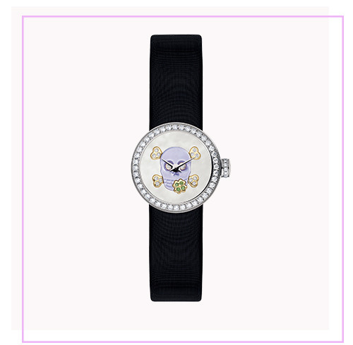 「薄紫のスカルが表現しているのは、いまを大切に生きるという考え方。スカルはムッシュ ディオールのラッキーモチーフである四つ葉のクローバーをくわえていて、何ともチャーミング。この時計にはお守りのようなマジカルパワーがありそう」