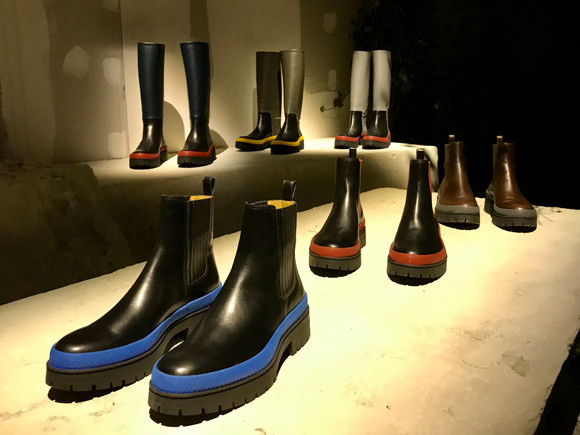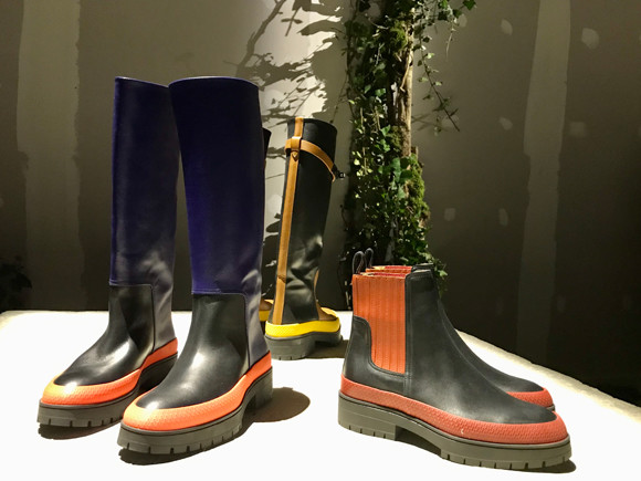 今回気がついたのは、シューズにおけるトレンドの形や素材の変化。こんな風にゴムみたいなブーツとか長めのブーツ(これは長靴といっていいのだろうか……)にトレンドがシフトしているな、と。実際街でストリートを撮ってても、お洒落だなって思っている人はスニーカーを脱いで、こういう系を履いてる人が多くって。