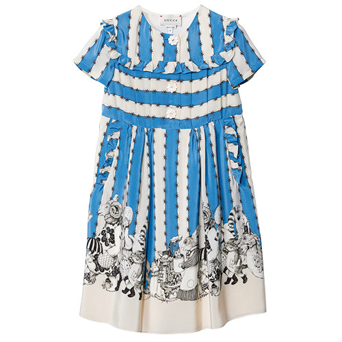 愛らしいシルクワンピースの裾を飾るのは、擬人化された動物たちの行列。¥123,200/グッチ(グッチ ジャパン)