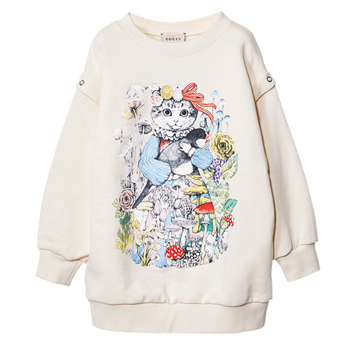 コットンのスウェットに、ドレスアップしたネコが佇む。袖のスナップボタンを外せば、スリーブレス仕様に。¥44,000/グッチ(グッチ ジャパン)