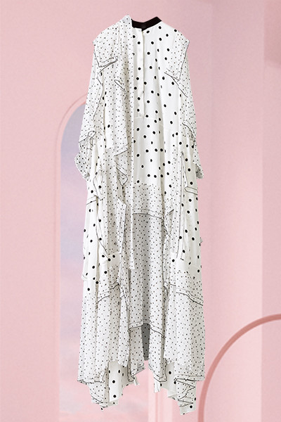 モノクロのドットをサカイらしくデコラティブに表現。2種類のドット柄シフォンが織りなすロングドレスは、花びらのように揺れるフリュイド感も美しい。¥217,800/サカイ