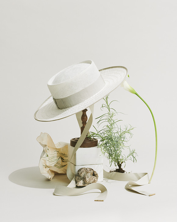 マニラ麻の葉を割いて作られる繊維、シゾールを贅沢に使いこなした逸品は、メンズのアンティークの型をもとにメンズ専門の熟練した職人が丹念に仕上げたもの。ソリッドなフォルムと繊細かつ光沢感のあるマテリアルがあいまって、凛としたエレガンスを漂わせる。