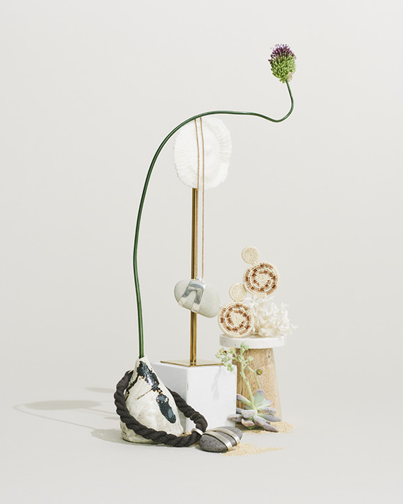 デザイナーの故郷であるコロンビアの椰子を伝承の技法で仕立てたピアスや、自然石にシルバーを纏わせたネックレスなど、人の手から生まれる温かみとコンテンポラリーなデザインが融合した新作たち。