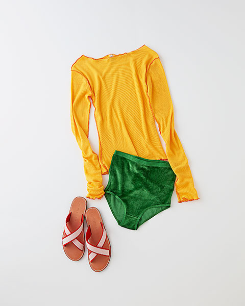 赤いトリミングが立体的なアクセントになるオレンジのトップに、グリーンのハイウエストショーツを合わせたビタミンカラーコーデでエナジーチャージ。トップ¥14,850、ショーツ¥6,710/ともにベースレンジ(ベースレンジ ジャパン) サンダル¥29,700/リュニフォーム(リュニフォーム トウキョウ)
