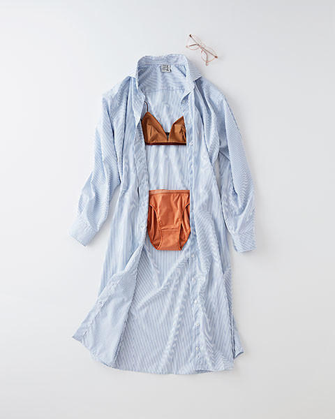 ブラウンのグラデーションで組み合わせたランジェリーの上からさっとロングシャツを羽織る、ヴァカンスならではのリラックスした提案。シャツドレス¥27,500/ベースレンジ(ベースレンジ ジャパン) ブラトップ¥5,060、ショーツ¥3,850/ともにオーバー ニース(ビオトープ) ヴィンテージのアイウエア¥5,940/スロウ 代官山店