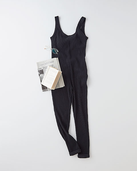 寝る前の読書やちょっとしたお出かけなど、夜も活発な彼女のために用意したいのは、ノースリーブが小粋なリブニットのジャンプスーツ。ジャンプスーツ¥17,380/プライベート・スプーンズ・クラブ(プライベート・スプーンズ・クラブ代官山本店) メガネ¥31,900/ブラン