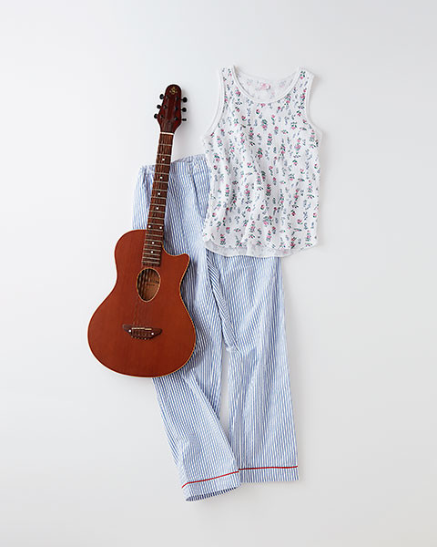 サーマルの花柄トップに、パジャマの定番、ストライプのワイドパンツを合わせてユニセックスなムードに仕上げる。キャミソール¥2,970/スロウ 代官山店 パンツ¥18,700/スリーピー・ジョーンズ(モットハウス・トーキョー)