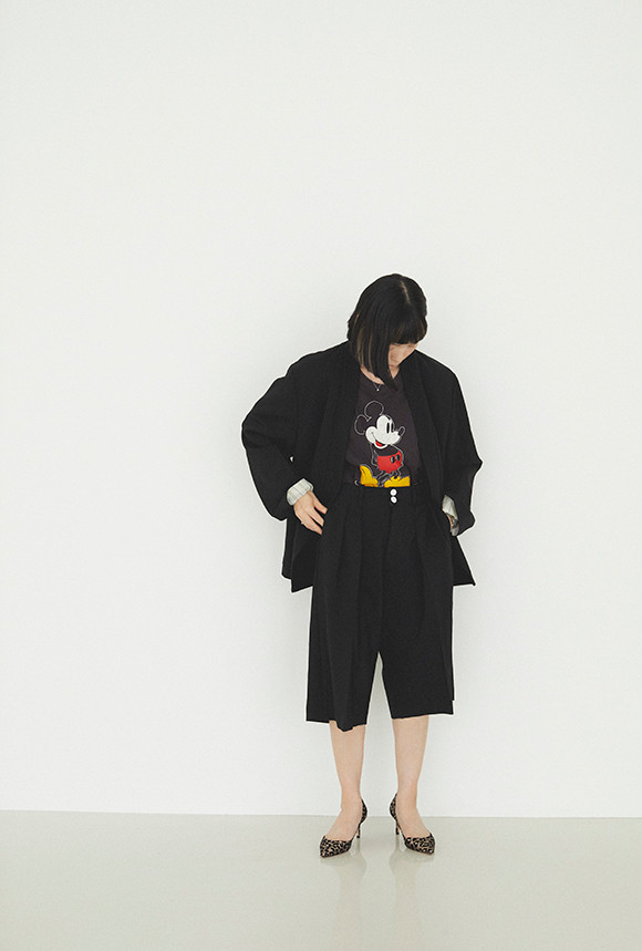 「このセットアップはトライ的なアイテム、自分らしく着こなすために、着慣れたキャラクターTシャツをインに。オーバーサイズを選んで少し抜け感も出してみました。足元は野暮ったくならないよう、ジミーチュウのヒョウ柄パンプスを」