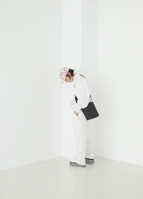 シャツ¥66,000、バッグ¥81,400/ともにエムエム6 メゾン マルジェラ(エムエム6 メゾン マルジェラ オモテサンドウ) つなぎ¥41,800/ヤーモ(グラストンベリーショールーム) キャップ、シューズ/ともにスタイリスト私物