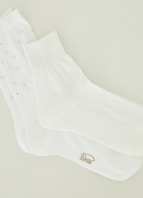 「靴下は昔から大好きなアイテム。カラーソックスも遊びがあって好きだけれど、ビジューやパールが付いた普通じゃない白もおすすめ」ソックス左:ビジュー¥6,380、右:パール¥3,740/ともにキワンダ(キワンダキワンダ)