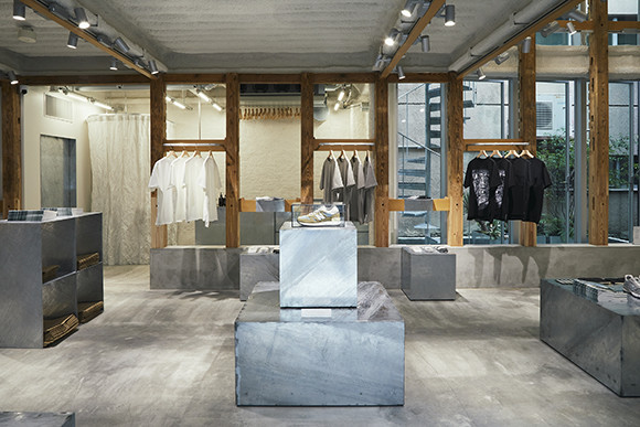 展開商品ももちろん気になるけれど、見所はそれだけでなく、この空間そのものも。川越にあった築122年の歴史ある蔵を移動させ、新しい機能として活用し、現代的な建築と融合させたユニークなものだからだ。意匠監修および内装設計は、建築家・長坂 常/スキーマ建築計画が担当。長坂のアイデアは、「伝統的な蔵をきれいに保存するのではなく、新しい機能と価値を与えて使う」というもので、これがまさにニューバランスの思想と一致したのだ。