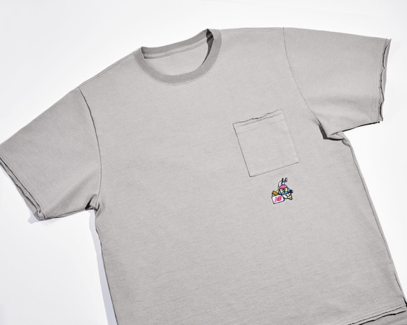 秋山貴世の描いたキャラクター「親父」が胸ポケットの下に小さく刺繍されている。「TOKYO DESIGN STUDIO New Balance × TAKAYO AKIYAMA 」Tシャツ¥14,300