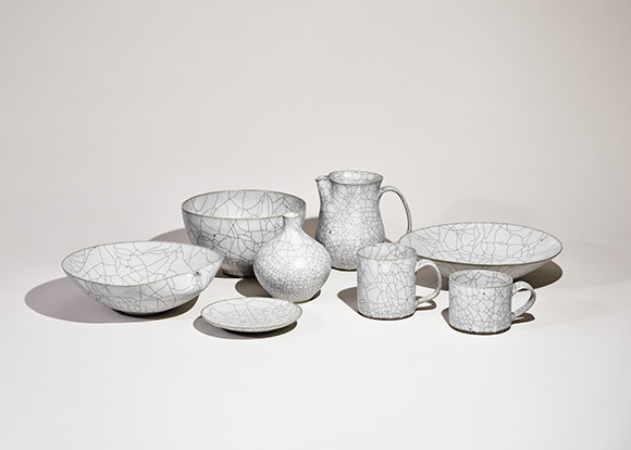 陶芸家/高田志保とティーハウス ニューバランスのコラボレーションによるストアオリジナルアイテム。京都・亀岡の工房で作陶された器類は、高田の作品の特徴である一般的なものより大きめな貫入に、墨の入ったマットな釉薬。器の裏には、ニューバランスの代表モデル「M1300」のソールを図案化したスタンプが押されている。「T-HOUSE × SHIHO TAKADA」セラミック ¥3,850~