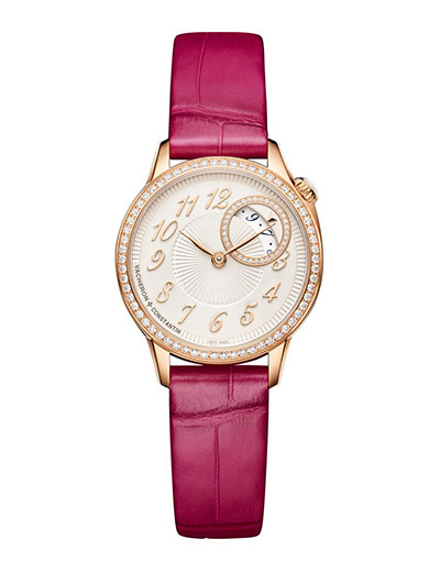 もっとも小さなケースサイズのクォーツモデルは、初めてのヴァシュロン・コンスタンタンにもベストチョイス。リューズ上のカボションにはムーンストーンも。写真のラズベリーピンクを含め計3色のストラップが付属。「エジェリー・クォーツ」(クォーツ、18Kピンクゴールド、Φ30mm、3気圧防水)¥2,094,400