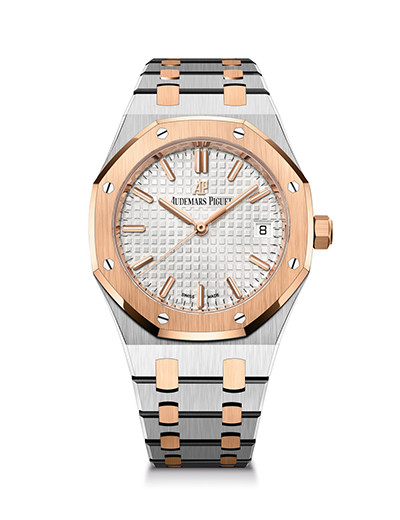 バリエーションは、華やかなピンクゴールド、カラーリングのセンスが光るSSとピンクゴールドのコンビ、SSから2型の計4型。SSのベーシックなモデルは、シルバーカラーの文字盤で「ロイヤル オーク」のアイコン “グランドタペストリー”が視線を惹き付ける。ダイヤモンドセットベゼルのモデルは、シャープな八角形ベゼルのフォルムをダイヤモンドの輝きが引き立てる。ブルーグレーのグランドタペストリーダイヤルとのコントラストで好感度の高いスタイルに。