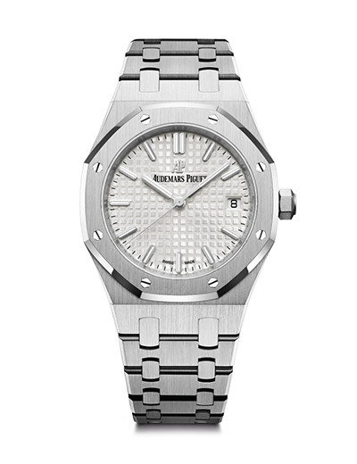 プレーンなスティールモデルは、「SSのラグジュアリースポーツウォッチ」の世界的なブームを起こしたファーストモデルを彷彿とさせる。アプライドアワーマーカーと“ロイヤル オーク針”はホワイトゴールド。「ロイヤル オーク オートマティック」(自動巻、SS、Φ34mm、50m防水)¥ 2,090,000