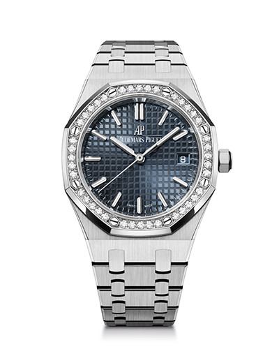 ブリリアントカットダイヤモンド40個(約0.71カラット)の煌めきがベゼルを彩る。ブルーグレー文字盤はコレクション内でも屈指の人気カラー。「ロイヤル オーク オートマティック」(自動巻き、SS×ダイヤモンド、Φ34mm、50m防水)¥2,640,000