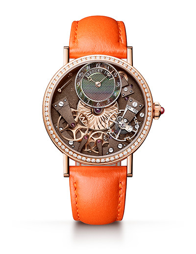 「トラディション レディ 7038」には、全世界のブレゲ ブティック限定の新モデルが。オフセンターの時刻表示ダイヤルでは、タヒチ産マザー・オブ・パールが美しい虹彩を放ち、鮮やかなオレンジのレザーストラップと趣を競う。