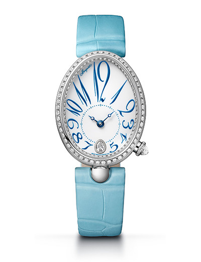 創業以来200年の歴史を持ち、マリー・アントワネットも愛用したブレゲ。今年もハイレベルなレディスウォッチの新作が姿を現した。オーバル形のケースが特徴的な「クイーン・オブ・ネイプルズ」には、初めてのピュアホワイト“グラン・フー・エナメル”文字盤が。高温焼成を何度も繰り返す伝統の手法で製作された清新な透明感と、ブルースティール針と同色のブルーのエナメルで描かれたブレゲ数字のインデックスがノーブルで爽やか。
