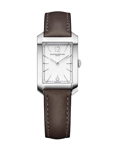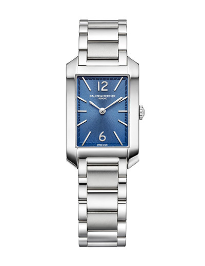 角形ウォッチが気になりだしたら、必ずチェックしたいのがボーム&メルシエの「ハンプトン」。幾何学的な直線が美しいフォルムは、アールデコ・デザインへのオマージュ。2020年は、さらに直線感アップのモダンスタイルに生まれ変わった。レディスにおすすめのスモールは、7年間連続駆動のクォーツムーブメントが頼もしい。文字盤には4つのバリエーション。印象的なブルーは光を捉えて色調を変える。外縁のミニッツ・トラックを深いブルーで切り替える小技も。