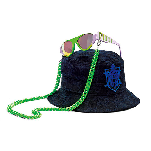 ハットのエンブレムはエミリオ・プッチとコシェの頭文字をミックスしたもの。ハット(参考商品)、サングラス¥36,300(ともに予定価格、8月中旬発売予定)/エミリオ・プッチ(エミリオ・プッチ ジャパン)