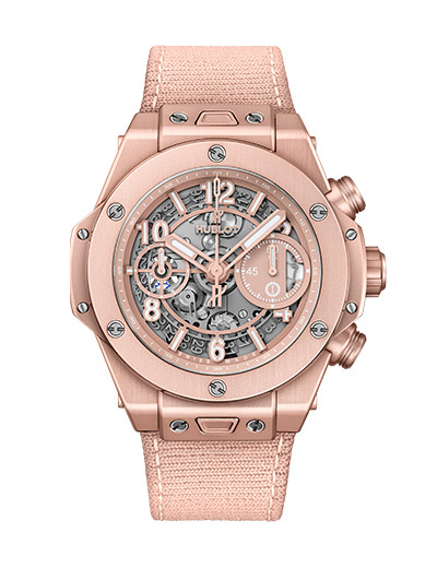 アイコニックな「ビッグ・バン」の「ミレニアルピンク」は、穏やかな可愛らしさも新鮮。独特の発色は、アルミニウム素材にアルマイト加工を施しつくられたもの。「ビッグ・バン ミレニアルピンク」(自動巻き、アルマイト加工アルミニウム、Φ42mm、100m防水、世界限定200本)¥2,442,000