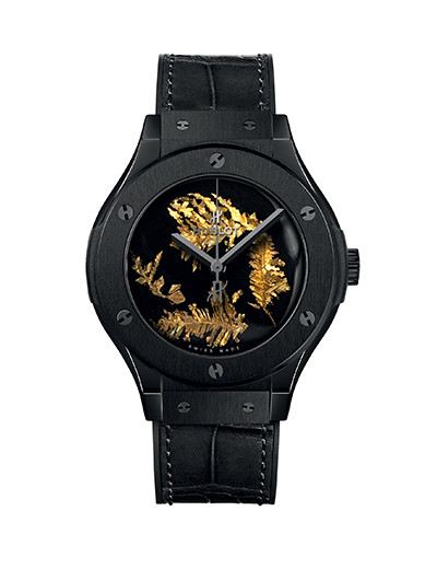 「クラシック・フュージョン ゴールドクリスタル」は、ブラックセラミックからゴールドクリスタルが放つ眩い輝きに魅了される。24金を融点まで熱して、放出された粒子が冷えてできる結晶“ゴールドクリスタル”。あり得ないようなマテリアルが描くランダムな模様を漆黒の文字盤に留めてみせる。ひとつとして同じものがないアートな文字盤のウォッチは、ラグジュアリーな芸術品。