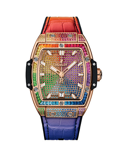 使用されたカラーストーンは18Kキングゴールドのケースに164個、ダイヤルに431個。ベゼルにはバゲットカットで62個。壮大な構想と緻密なセッティングで、虹を捉えた。「スピリット オブ ビッグ・バン キングゴールド レインボー」(自動巻き、18Kキングゴールド、Φ39mm、100m防水)¥10,791,000