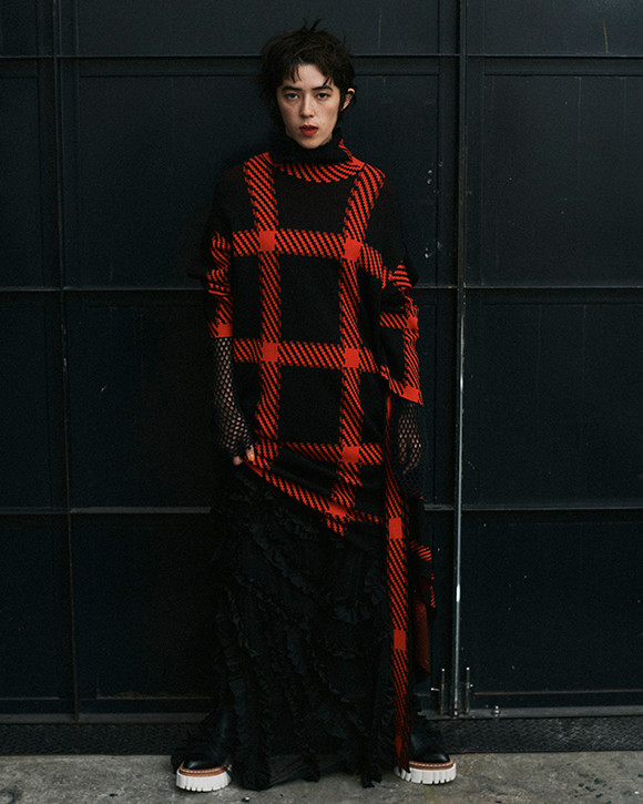 ニットドレス¥198,000、ブーツ¥123,200/ともにステラ マッカートニー(ステラ マッカートニー カスタマーサービス) 中に着たニットトップ¥28,600/ジョン ローレンス サリバン オーガンジースカート¥64,900/チカ キサダ