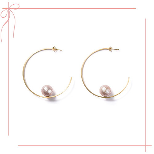 ピンクを纏ったパールは、パールの中でも特にラッキーアイテム。ソリッドなフープと組み合わせたデザインで、さりげなく耳元でセンスを光らせて。