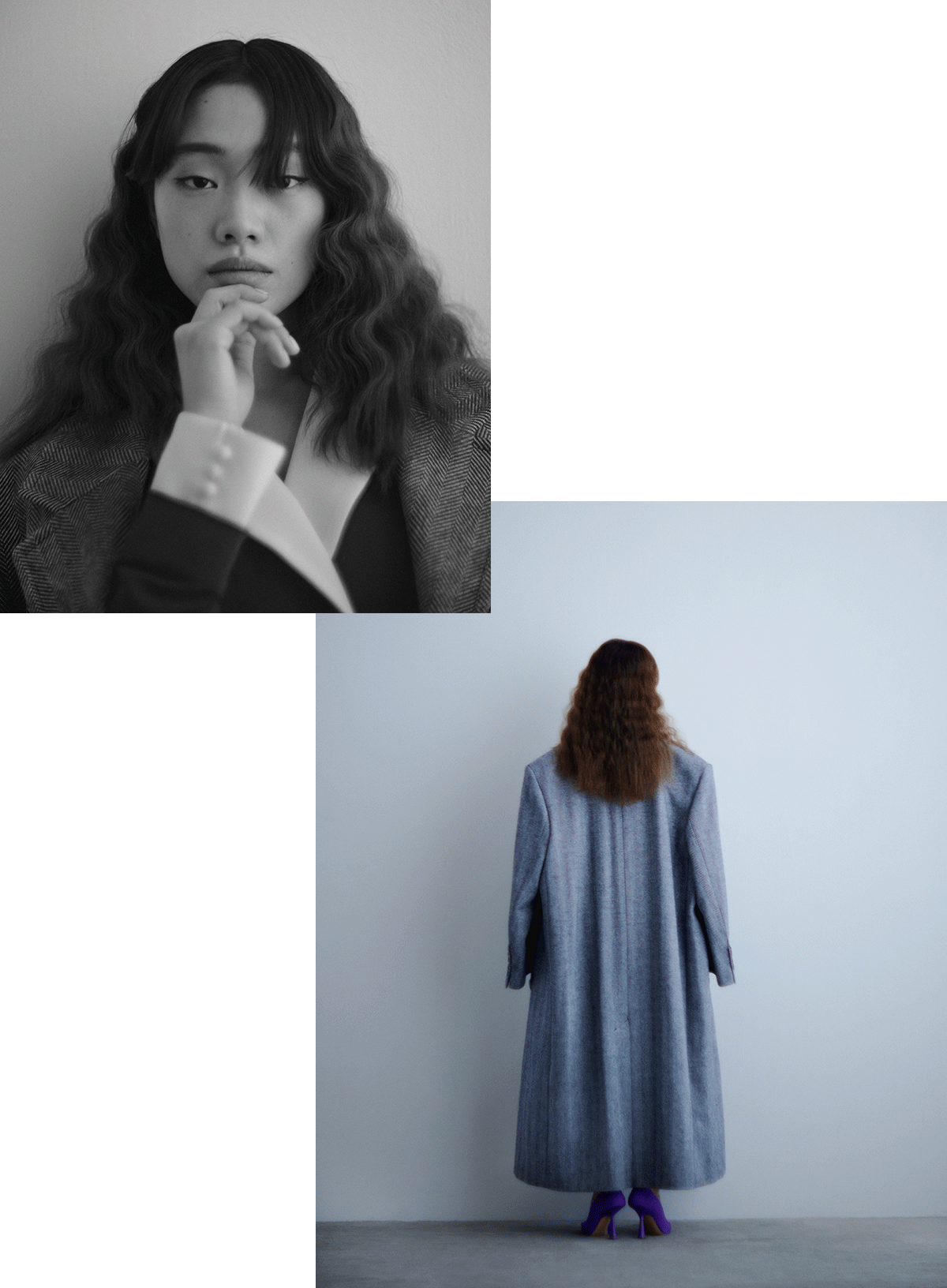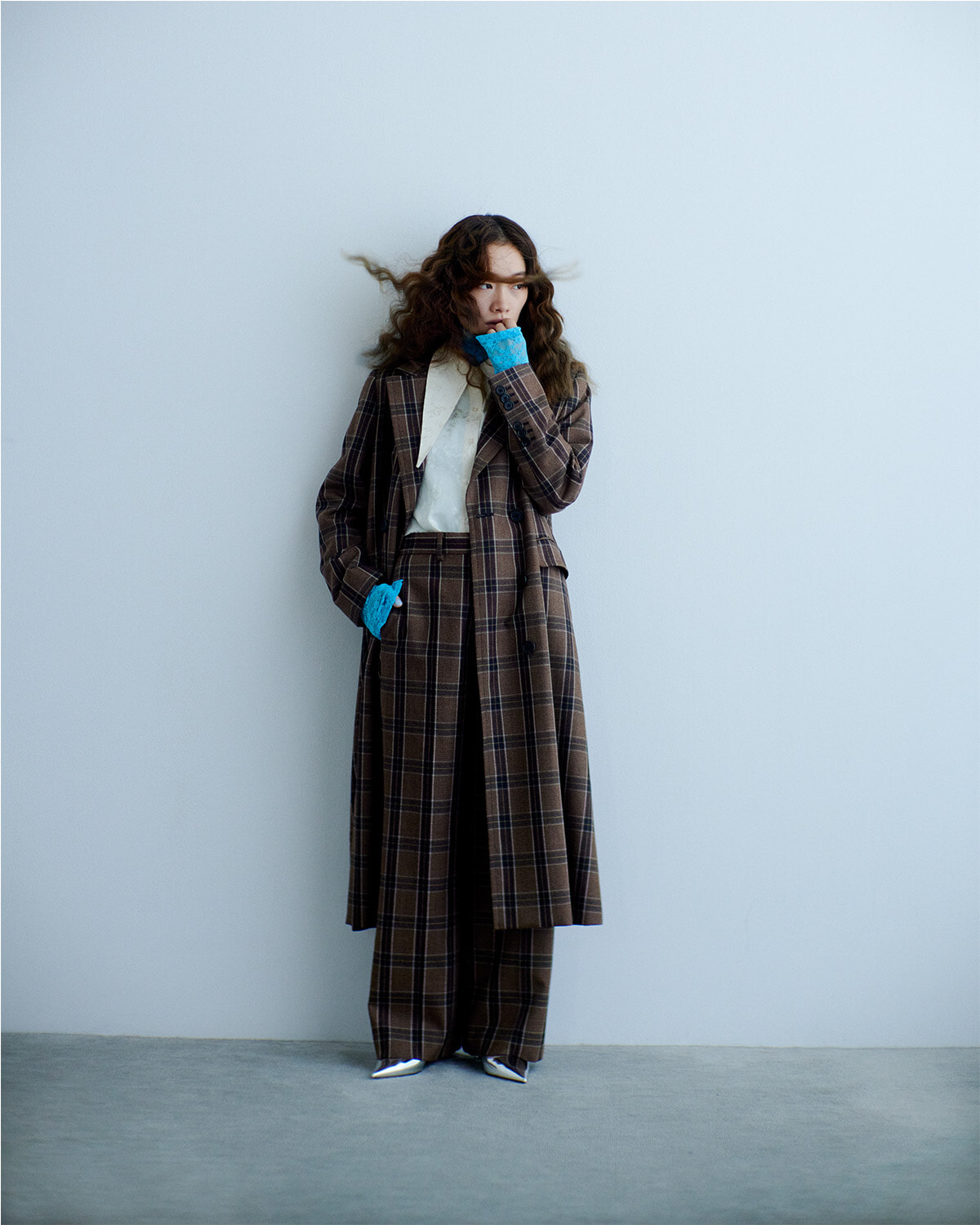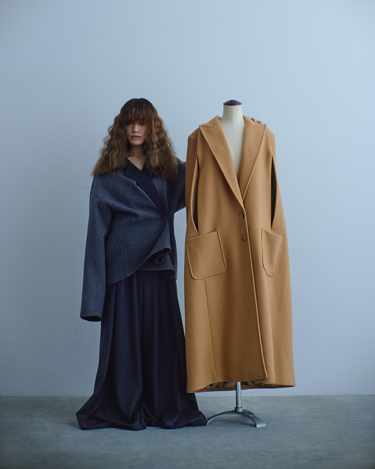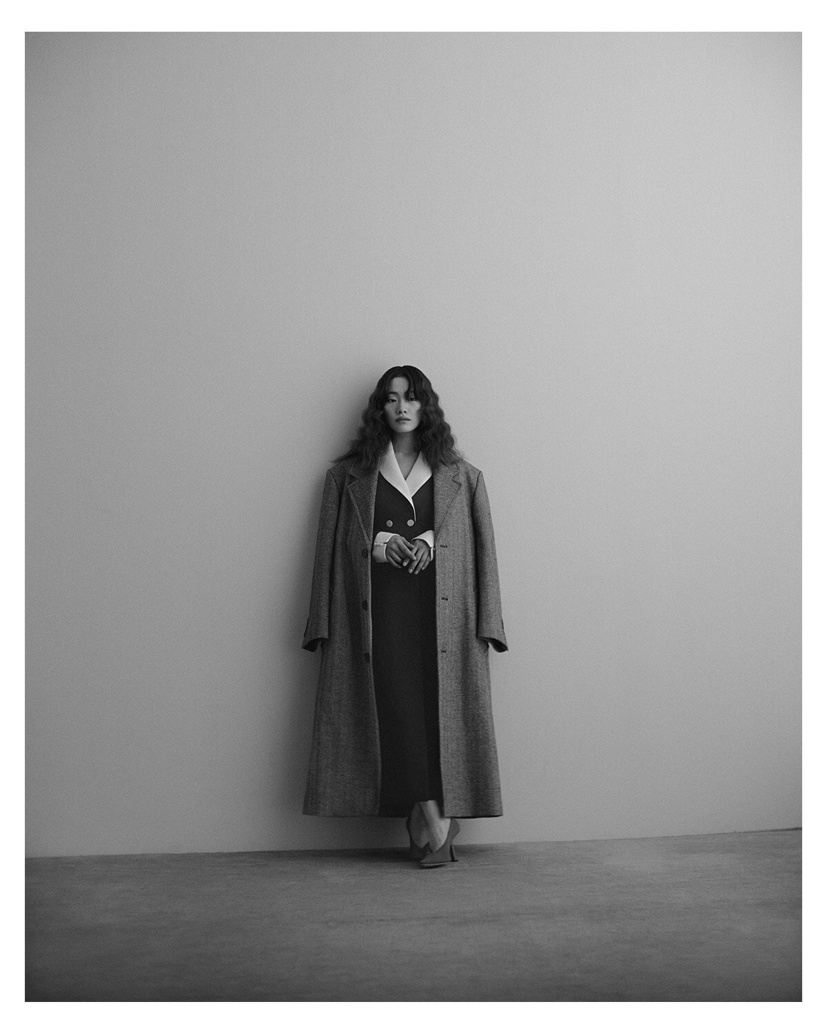 ビッグシルエット&フロアレングスのメンズライクなサイジングも上品なコーディネートを完成させる重要なポイント。ジェントルなヘリンボーン柄も優雅な姿勢を紡ぎ出す。「オーバーサイズのコートをマニッシュではなく、あえてレディライクに着るというのは今年らしさを出すためのエッセンス。クラシカルなムードが引き立って、シンプルなスタイリングが一気に存在感のあるものに」(山本マナ)