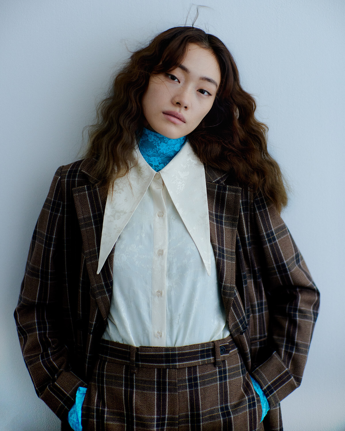 程よいトレンド感と品格の両方が共存するのは、端正なタータンチェック柄だからこそ。英国トラディショナルを大切にしているポール スミスならではのシャープなシルエットがハンサムなムードをさらに加速する。「2023年秋冬はトレンドキーワードとしてもチェック柄が目立つシーズン。中でもシックなブラウン系は取り入れやすく、かつ、きちんと個性も発揮できる。同柄のパンツとセットアップにすることでトレンドをさらにバージョンアップさせて着るのがおすすめです」(山本マナ)