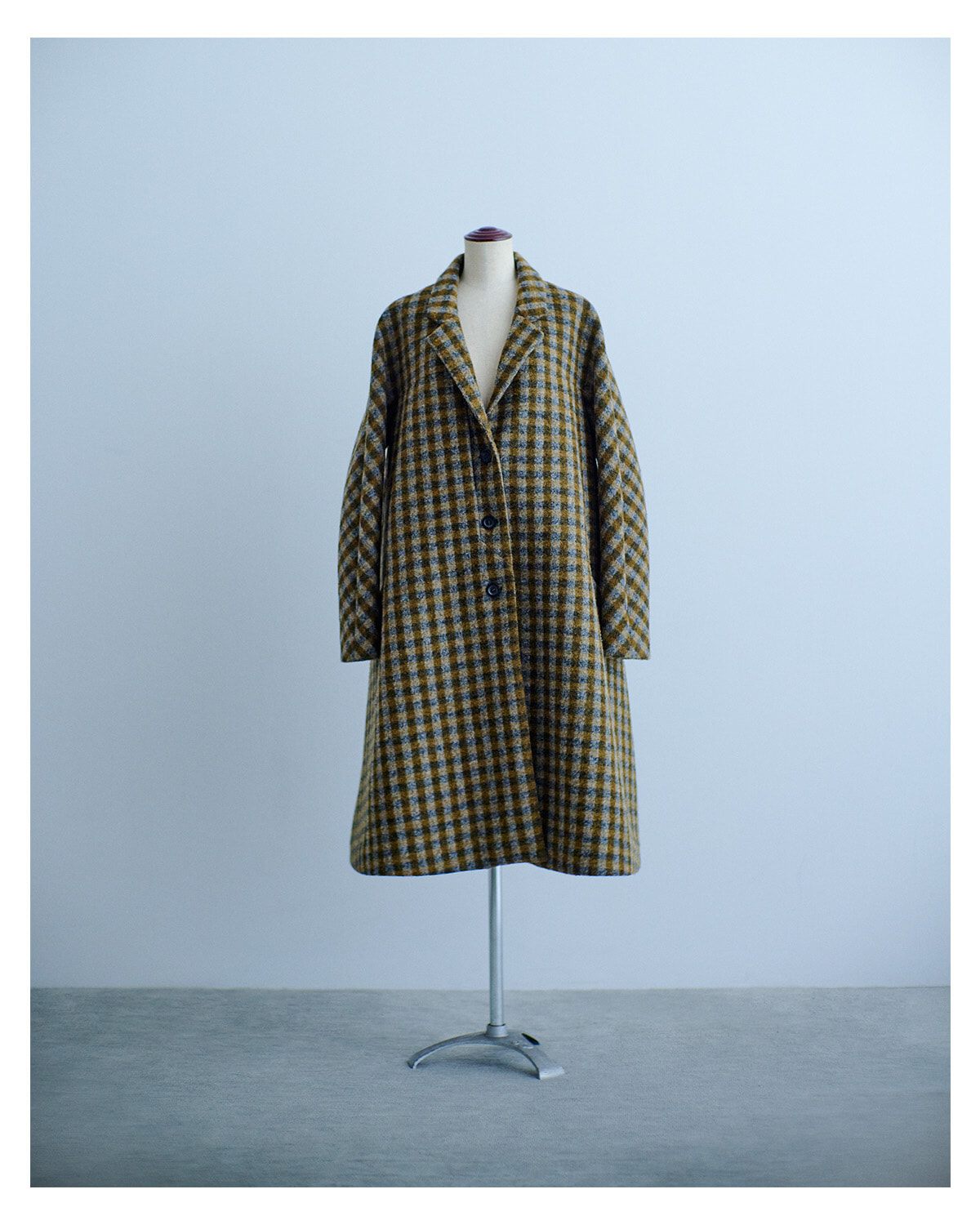 Aラインとトラッドなガンクラブチェックのコンビネーションが物静かな重厚感を放つ一枚。グランマから譲り受けたようなどこか懐かしいデザインのコートは、その存在感を生かしてエレガントに着こなしたい。