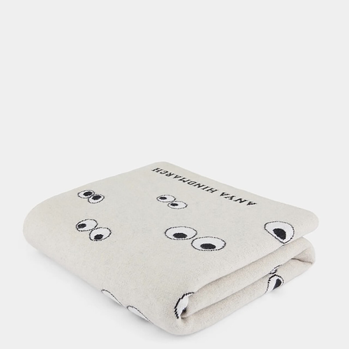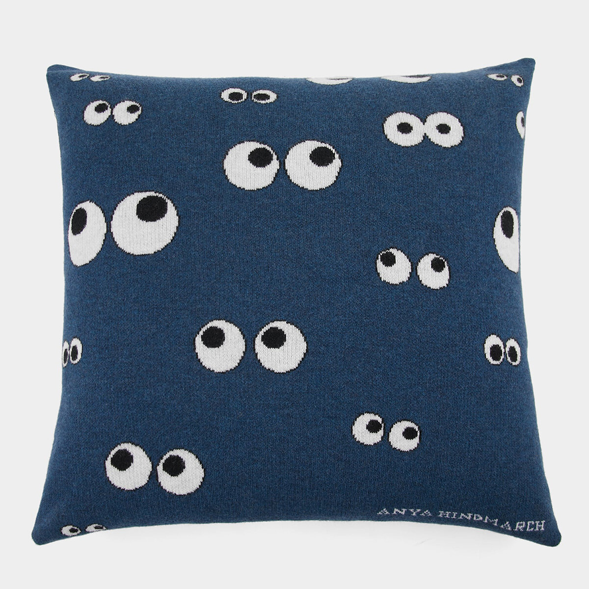 ブレックファーストセット¥33,000、オールオーバーアイズ クッション(H50×W50cm)¥46,200、オールオーバーアイズ ブランケット (H185×W130×D0.3cm)¥118,800/以上アニヤ・ハインドマーチ(アニヤ・ハインドマーチ ジャパン)