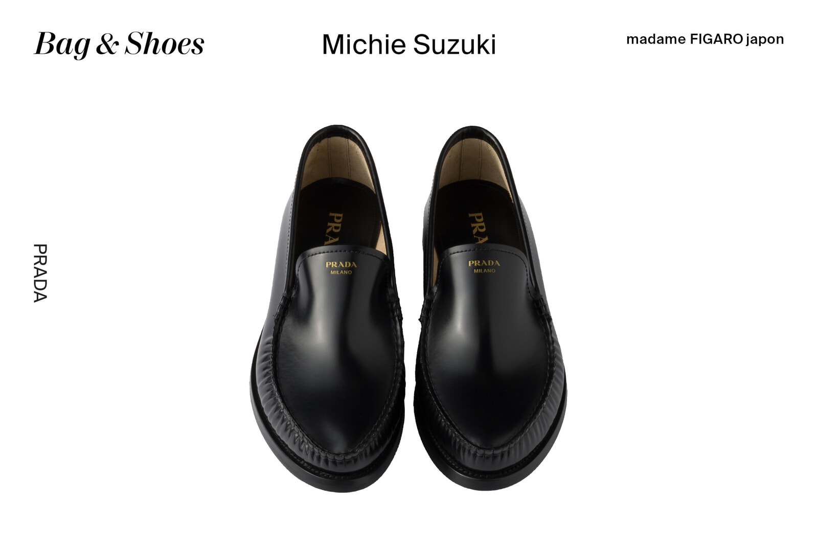 レザーの艶を生かした潔いシンプルさ。飽きのこない一生の定番として選んだのはプラダのローファー。「ここしばらくサボやサンダルの気分だったのですが、新たにシューズボックスの定番として迎え入れたい一足です。学生気分で厚手の靴下に合わせて履きたい!」スクールライクなスタイリングはもちろん、クラシックな佇まいはどんなスタイルにも寄り添い、長く愛せる一足になりそう。