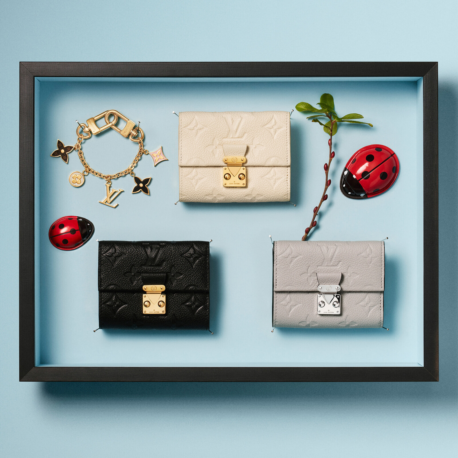 上:「ポルトフォイユ・メティス コンパクト」(H 8.5 x W 11.5 x D 4 cm)¥157,300円 左下:「ポルトフォイユ・メティス コンパクト」( H 8.5 x W 11.5 x D 4 cm )¥157,300円 / 右下:日本限定の「ポルトフォイユ・メティス コンパクト」( H 8.5 x W 11.5 x D 4 cm)¥157,300(2月28日発売予定*先行予約受付中)/ともにルイ・ヴィトン(ルイ・ヴィトンクライアントサービス)