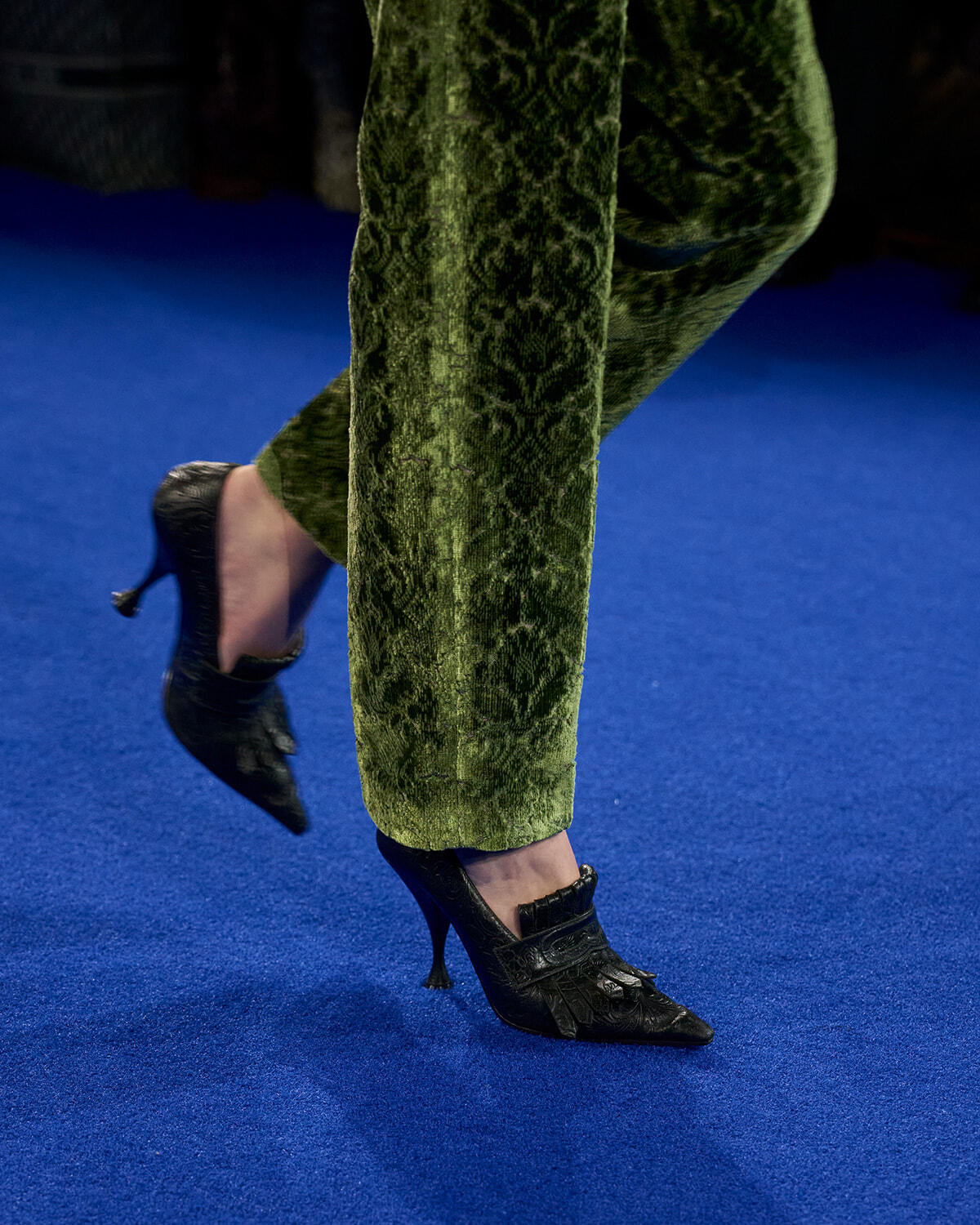 インテリアファブリックを思わせるダマスク柄のベルベットのドレスやテーラードスーツは、70年代のロックスターの装いを彷彿とさせる。
