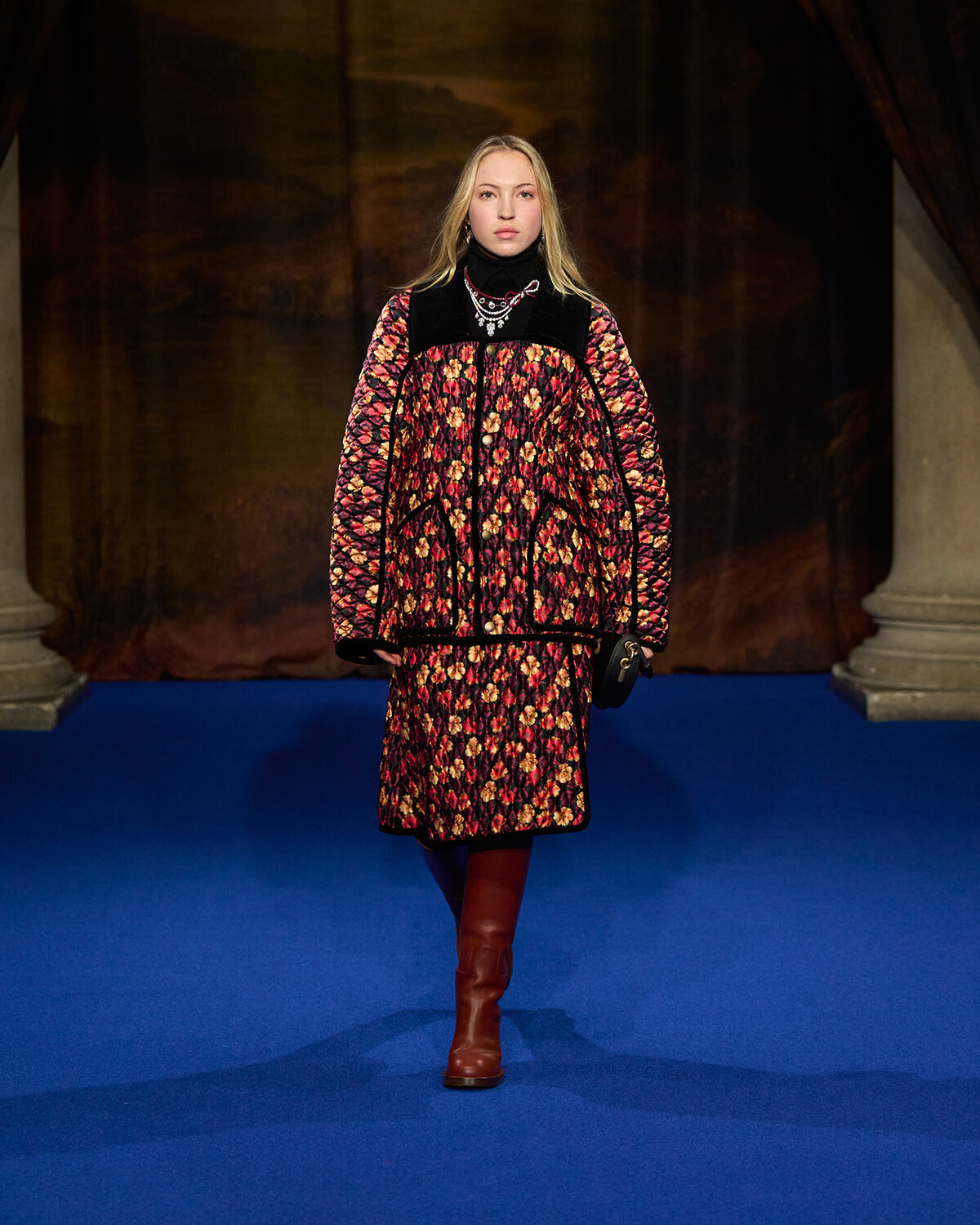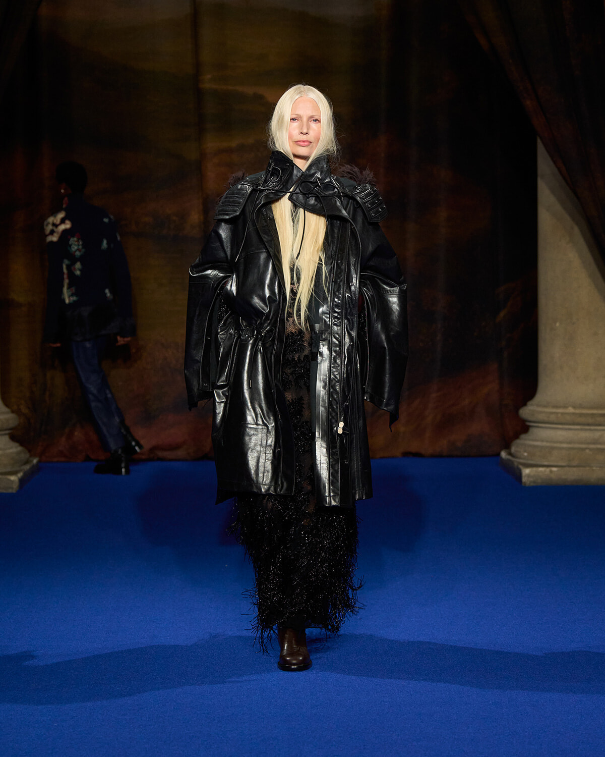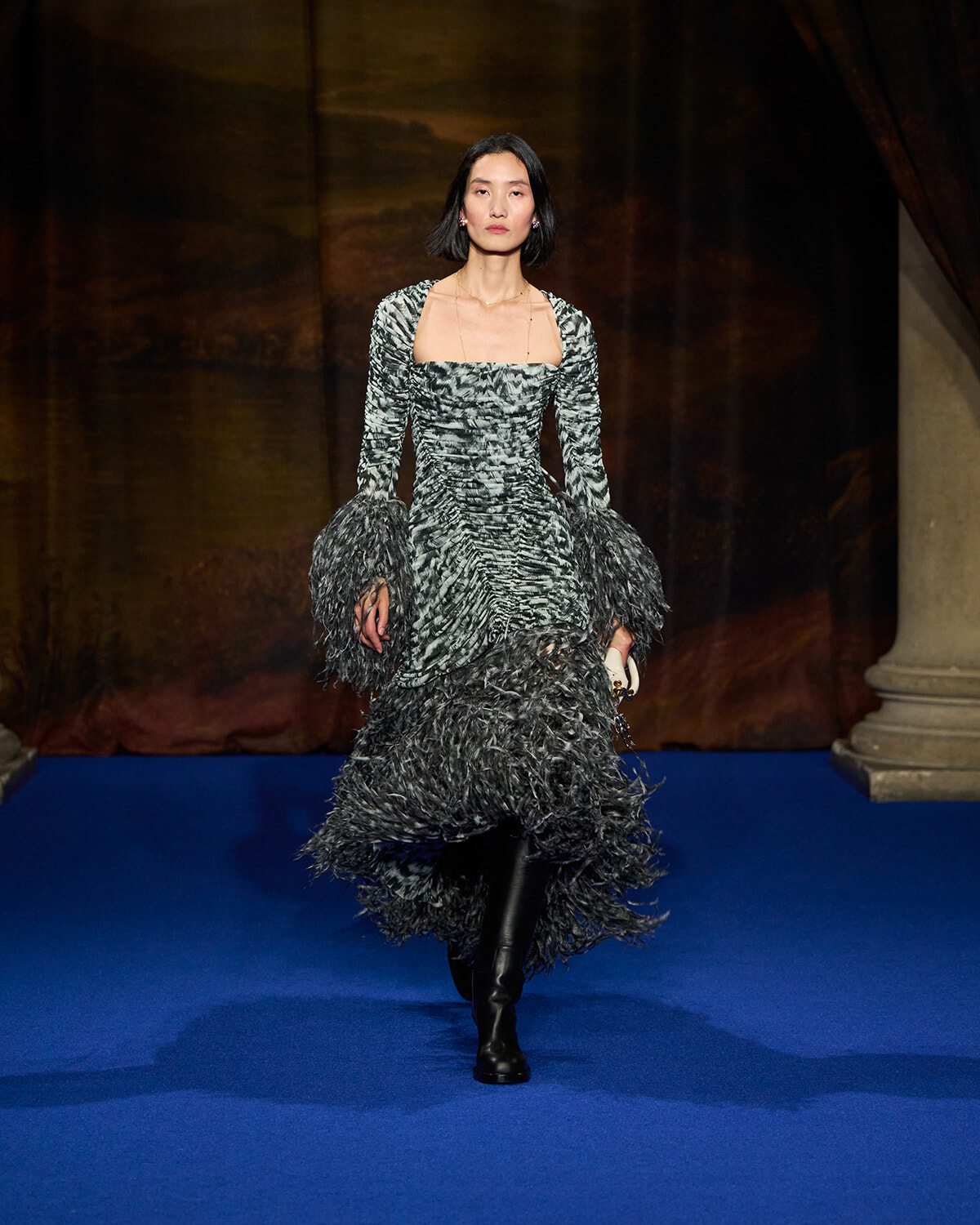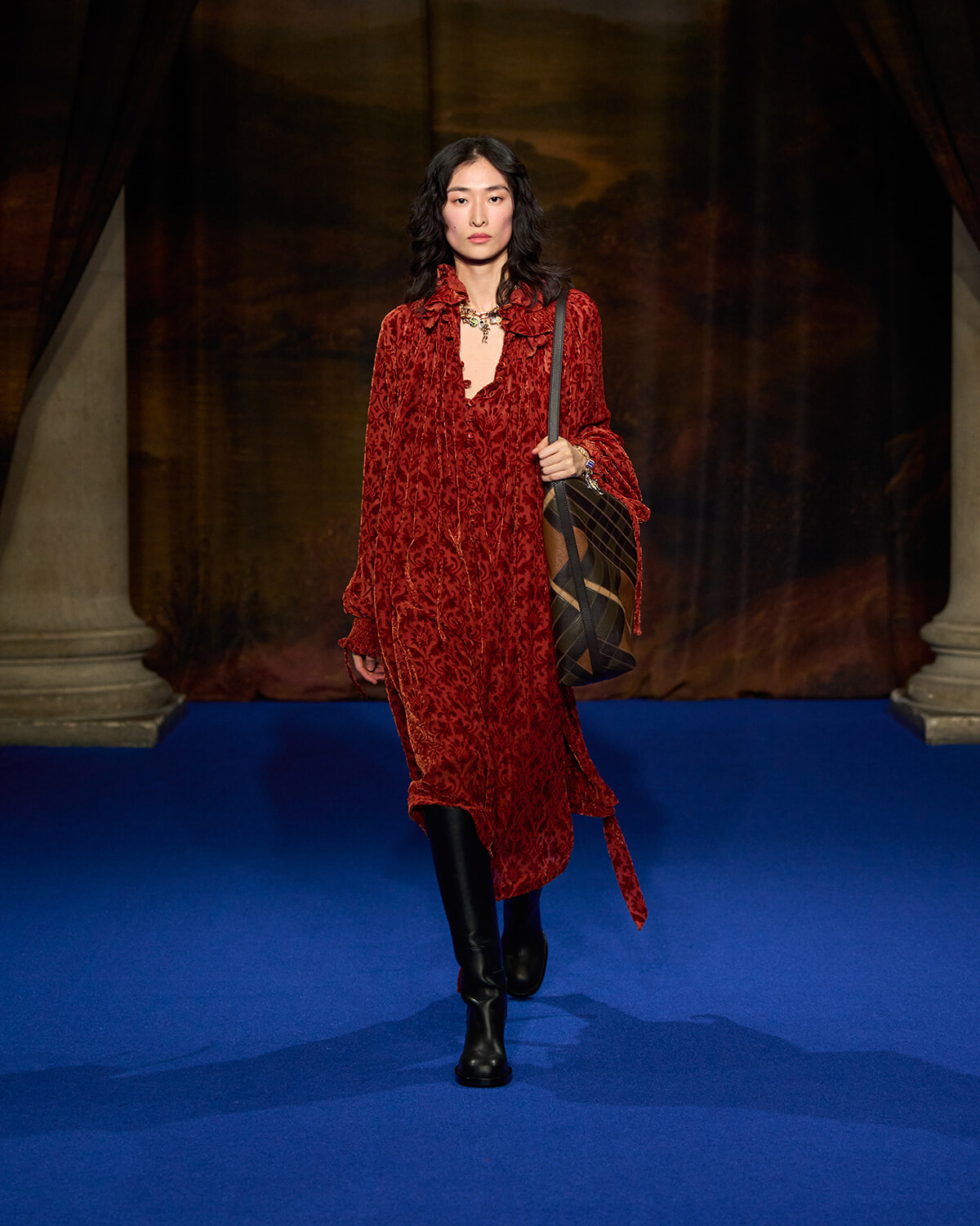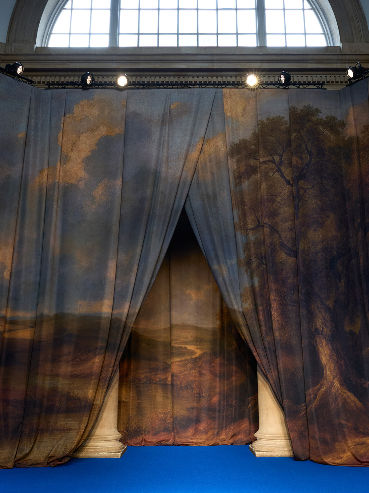 イギリスの広大な田舎の情景を描いた、ドレープをふんだんに寄せたカーテンがランウェイを取り囲む。