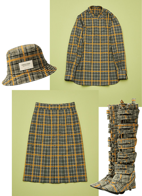 シャツ¥59,400、スカート¥66,000、帽子¥19,800、ブーツカバー¥80,300/以上ビューティフルピープル