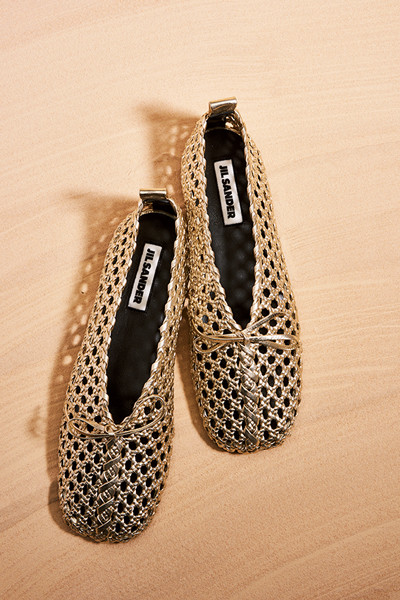 バレエシューズ風のデザインを、ゴールドレザーのメッシュでエキゾティックに。