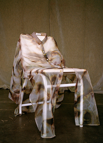 オーガンジーに転写プリントを施したシースルーのロングシャツは、レイヤードの着こなしに活躍。