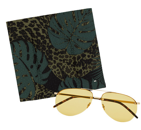アニマルモチーフと熱帯植物をプリントしたスカーフに、ティアドロップ型のサングラス。メゾンが得意とするサファリスタイルを完成させるリュクスな脇役。