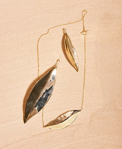 光と風を受けて舞う葉をイメージした有機的なフォルムがアーティスティック。いずれもシルバーに14金のコーティング素材。