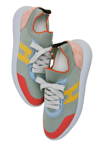 シグネチャーカラーであるオレンジ色のパイピングやHのモチーフでグラフィカルに仕上げた、ニットとレザーのコンビネーション。超軽量のEVAソールとリブ付きエッジで快適さも極上。