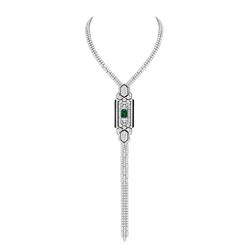 クラバット エメロード。8.02カラットのエメラルドを中心に据えたアールデコ・モチーフのロングネックレス。