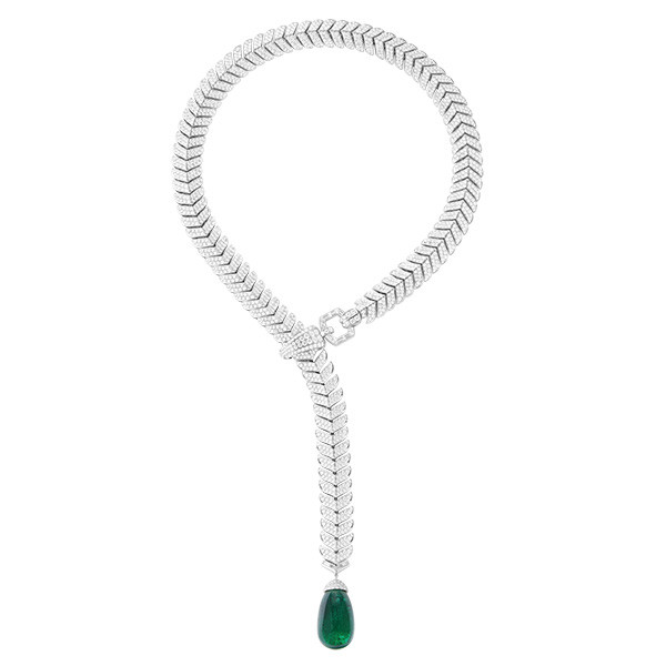 先に紹介したリュバン ディアマンと同じく、このネックレスのモチーフもシェヴロン(ヘリンボーン)にインスパイアされている。パヴェダイヤモンドをセットしたホワイトゴールドのチェーンは、装飾的なクラスプを移動することで長さが調節できる優れたデザインだ。61.35カラットのエメラルドドロップはザンビア産。