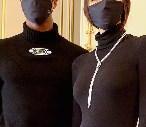 新コレクションのお披露目にて。アールデコ・モチーフは簡単にネックレスから取り外すことができ、ブローチとなる(左)。ブローチを外したブラック&ホワイトのロングネックスも美しい。photo:Mariko Omura