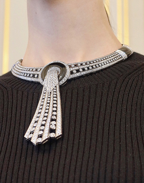 アールデコを象徴するシェヴロン(ヘリンボーン)。パーフェクトな美に手を加えるのは不必要と、クレールは1928年のブレスレットのパターンをそのままこのリボンジュエリーに活用した。グラフィックな黒いラインは、これはブラックラッカーによるものではなく、ダイヤモンドのエレメントのそれぞれの間の空間が作り出す一種の目の錯覚。長いリボン状のジュエリーは4つの着け方ができる。ヘッドバンド、チョーカー、あるいは2本のブレスレットとして。さらに男性がタキシードのベルトとしての着用も。