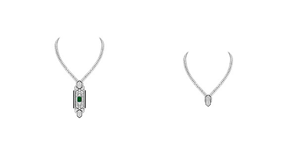 1920年代、自由を求める女性たちの装いは軽くなり、ときにはメンズのワードローブにインスパイアされた装いをして外出をした。そんな時代の柔らかなシルクのネクタイを思わせるのが、ネックレスのクラバット エメロードだ。これは中央のエメラルド、オニキス、ブラックラッカー、ダイヤモンドによる縦長のモチーフが取り外せる。それによって、男女で楽しめる5通りのジュエリーとなるのだ。3つのコントラストが見事に反映された逸品である。