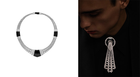 ダイヤモンドのスカーフタイのような華やぎのあるピュアなネックレス。センターピースはクレールがアーカイブのブローチにインスパイアされたモチーフである。オニキスとダイヤモンドを組み合わせたブラック&ホワイトは、アールデコスタイルを代表するスタイルだ。揃いのリング、イヤリングもある。センターピースが外れるネックレスは3通りに使え、男性も女性も楽しめるデザイン。